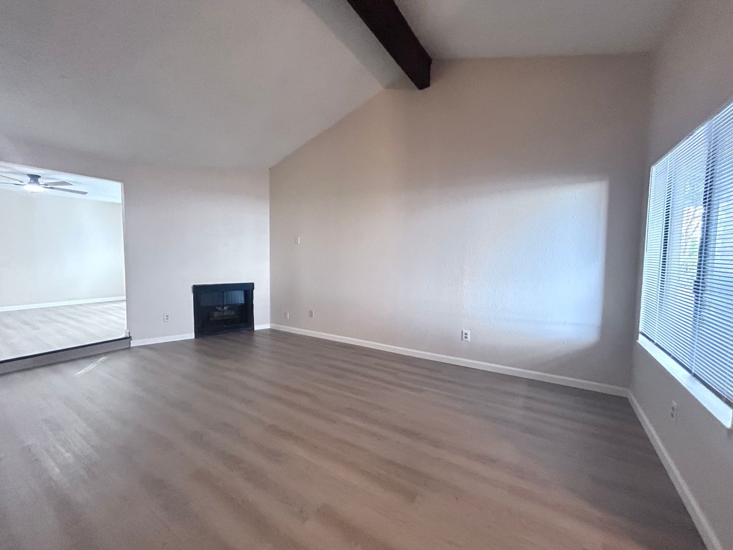 The interior features new wood flooring, adding a touch of elegance and warmth to the space. The living area is complemented by a cozy fireplace, creating a perfect setting for relaxing evenings at home.